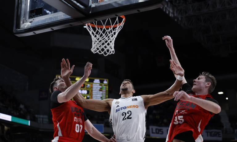 Ya en el segundo tramo del duelo, Kostas Antetokounmpo puso los primeros puntos del UCAM Murcia desde la línea de libres (23-29). Dos canastas al poste y un triple de Kurucs ponían el +11 momentáneo cumplidos los dos primeros minutos del segundo tramo (25-36). Dylan Ennis lanzó un alley oop a Kostas Antetokounmpo para sumar un parcial de 0-9 favorable al UCAM Murcia (25-38). Sito Alonso solicitó un tiempo muerto tras un parcial de 8-0 favorable al rival (33-38). Stephens anotaba nuevamente de tres (3/3 T3) para sumar 12 puntos a su casillero a dos minutos para la llegada del descanso (35-43). La primera parte del encuentro finalizó con un resultado de 37-43 (14-15) favorable a un UCAM Murcia que lanzó un 66% en tiros de dos puntos (10/15) y un 46% en tiros de tres (6/13). El Real Madrid sumaba 9 pérdidas antes del entretiempo, por las 10 del UCAM Murcia. Jonah Radebaugh recuperó 3 balones durante la primera parte, y Stephens fue el máximo anotador con 12 puntos (1/1 T2 - 3/3 T3) en 10 minutos de juego.