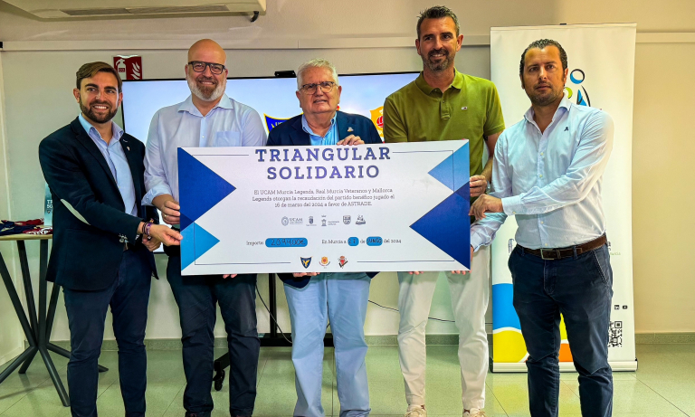 El presidente de Astrade, Javier Ruiz de la Torre, ha agradecido la iniciativa benéfica del Triangular y ha destacado la enorme generosidad de los aficionados con esta causa, tras recibir la donación de la taquilla de 2.094 euros por parte del director general de Deportes de la UCAM, Pablo Rosique, en representación del UCAM Murcia Legends junto a Víctor Lobo; Juan José Fernández, vicepresidente del Real Murcia CF; y Miguel Sánchez, como representante del Mallorca Legends.