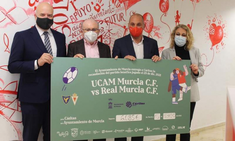 Ayuntamiento de Murcia, UCAM Murcia y Real Murcia han formalizado hoy la entrega a Cáritas Murcia de la cantidad recaudada en el partido benéfico de Navidad que enfrentó a ambos clubes el pasado 29 de diciembre en el Estadio BeSoccer La Condomina.