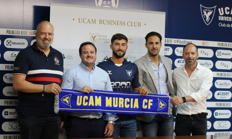 El atacante Chuma ha sido presentado esta mañana en la sala de prensa del Estadio BeSoccer La Condomina. El sevillano ha estado acompañado por Pablo Rosique, director general del servicio de deportes de la UCAM, Juan Antonio Baños, vicepresidente de estrategias y patrocinios del Club, Antonio Gómez Fayren, director territorial de Asterra Partners en Murcia y Alicante y Miguel Linares, director deportivo del Club.