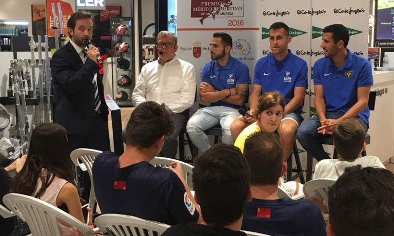Tekio, Góngora y Nono participaron en la charla 'Un año en 2ª División', organizada por la Asociación de la Prensa Deportiva de Murcia y El Corte Inglés, que estuvo comandada por el jefe de deportes de la Cadena COPE en Murcia, Vicente Luis Cánovas.