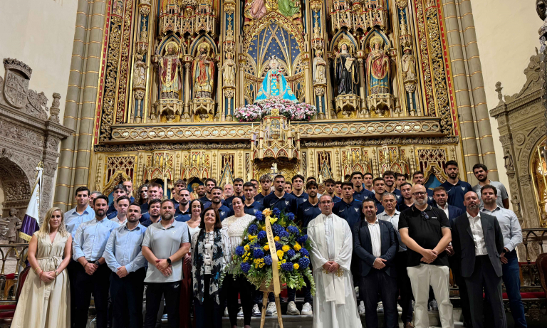 Para concluir, los capitanes Javi Ramírez, Fer Román, Luque y José Ruiz, en representación de sus compañeros, han ofrecido un bonito ramo de flores azules y amarillas, colores del Club, a Nuestra Señora de la Fuensanta antes de posar todos juntos en el altar mayor para inmortalizar este momento.