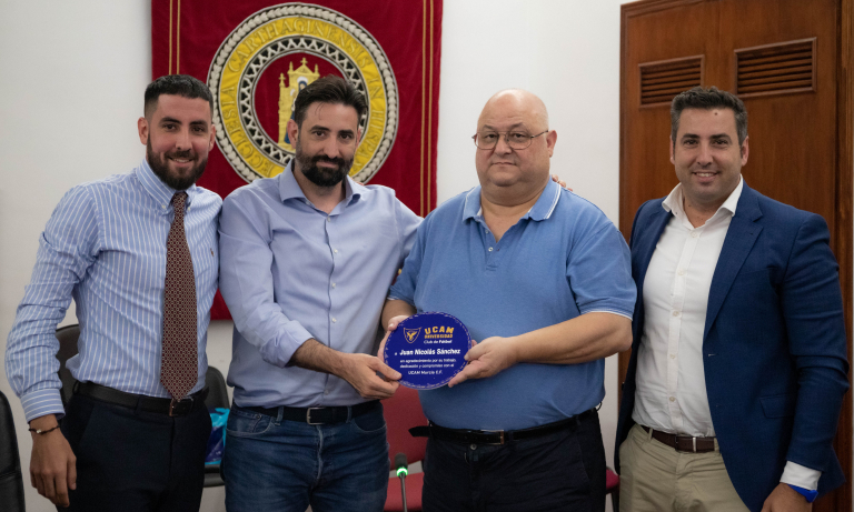 Esta decisión se ha hecho firme en la sesión de esta mañana que ha realizado la junta directiva en el Campus de los Jerónimos de la UCAM. José Luis Mendoza, Samuel Mendoza y Juan Pablo Mendoza , en nombre de nuestro presidente José Luis Mendoza Pérez, le ha entregado una placa conmemorativa en recuerdo y agradecimiento a toda su labor llevada a cabo desde la fundación del UCAM Murcia CF.