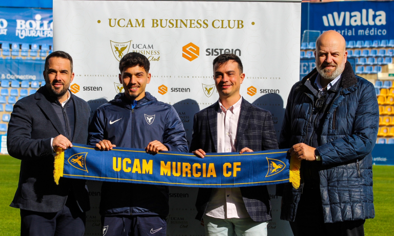 El reciente fichaje Pablo Hernández ha sido presentado esta mañana ante los medios de comunicación en la sala de prensa del Estadio BeSoccer La Condomina de la mano de Sistein, nuevo miembro de nuestro UCAM Business Club. Además, el futbolista ha estado arropado por Pablo Rosique, director general de deportes de la UCAM, y Álvaro Muñoz, director deportivo del Club.
