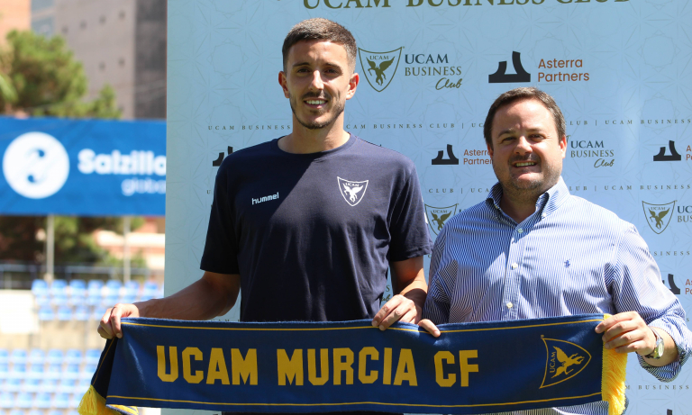 El delantero Alberto Ródenas ha sido presentado hoy en la sala de prensa del BeSoccer La Condomina como nuevo jugador del Universidad Católica de Murcia Club de Fútbol para esta temporada 2023/24. El jugador ha estado arropado por Juan Antonio Baños, directivo del Club; Miguel Linares, director deportivo y Antonio Gómez Fayren, director de Asterra Partners en la Región de Murcia. Dicha empresa ha sido la encargada de apadrinar esta presentación tras ampliar su vinculación con nuestro UCAM Business Club.