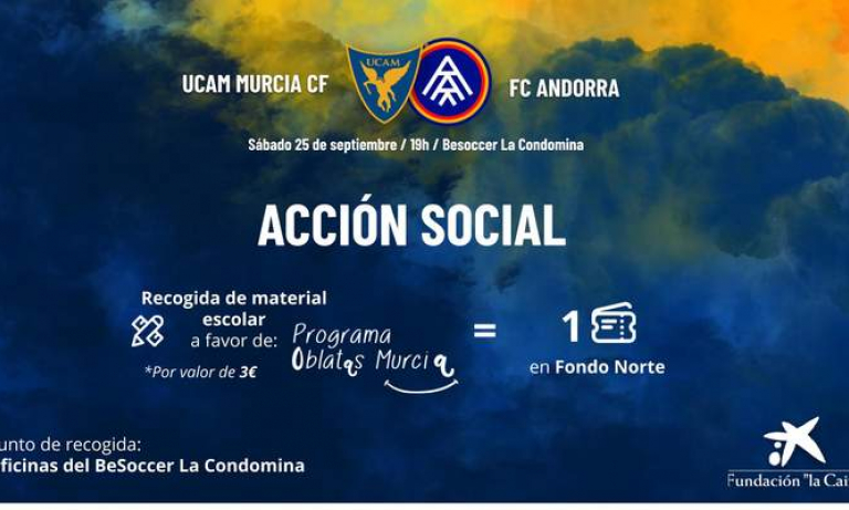 El Universidad Católica de Murcia Club de Fútbol llevará a cabo este fin de semana una acción solidaria con motivo del enfrentamiento ante el FC Andorra (sábado 25 de septiembre a las 19h) en el BeSoccer La Condomina. Para este choque liguero, el protagonista será Programa Oblatas Murcia.