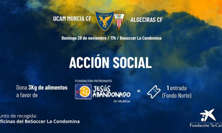 De tal modo, el Club premiará con una entrada en Fondo Norte para el UCAM Murcia - Algeciras (domingo 28 de noviembre a las 17h) a todas aquellas personas que esta semana lleven 3kg de alimentos no perecederos a las oficinas del BeSoccer La Condomina. Todos los alimentos irán destinados a la Fundación Jesús Abandonado.