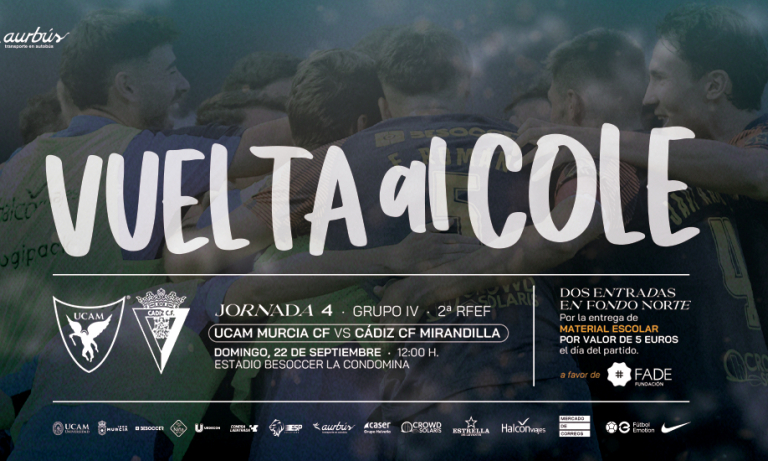 Por esa razón, todas aquellas personas que colaboren donando cualquier tipo de material educativo, por valor de 5€, se le obsequiará con dos entradas para el UCAM Murcia CF - Cádiz CF Mirandilla en Fondo Norte.