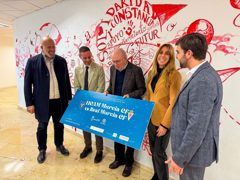 Ayuntamiento, UCAM Murcia CF y Real Murcia hacen entrega a Cáritas de la cantidad recaudada en el Partido Solidario Murcia 1200