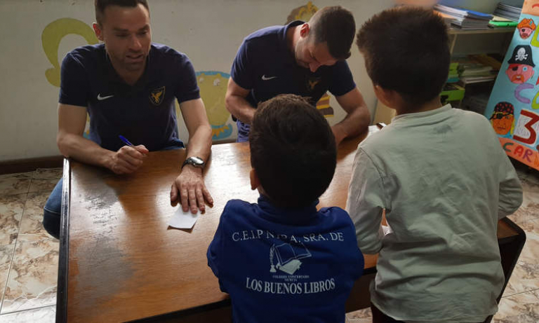 Ambos jugadores compartieron un rato con los más pequeños en una de las aulas del colegio, respondiendo a sus preguntas y contándoles cómo es la vida de un futbolista profesional.