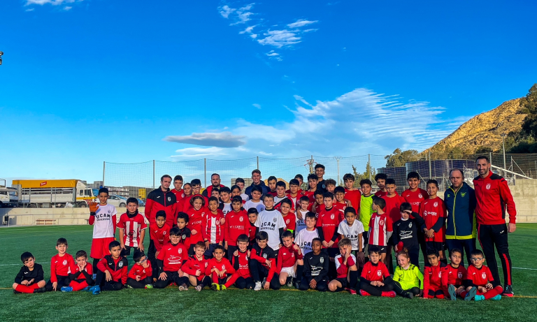 El futbolista muleño, que acaba de cumplir 50 partidos con la elástica azul y dorada, ha compartido un rato agradable con los niños, respondiendo a todas sus preguntas y compartiendo curiosidades antes de comenzar el entrenamiento de los jóvenes talentos de nuestro club afiliado.